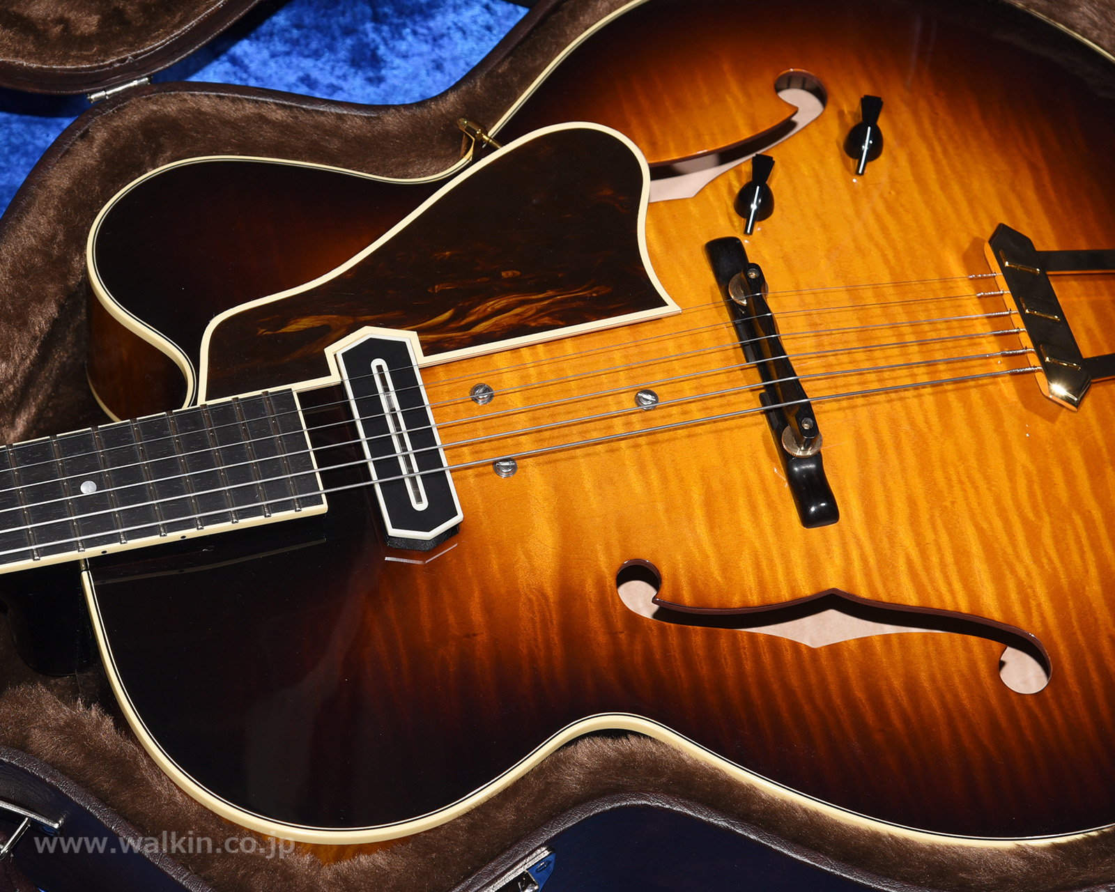 特注のAAAグレード・ハードメイプル・プライウッド、薄く丁寧に仕上げたグロスのラッカー塗装、そしてオリジナルのCCピックアップ、合わせて製作された専用設計のピックガードなど、ディテールも拘りの仕様。エボニー製のブリッジ・アッセンブリーについては、実際にバーニー・ケッセル氏が使用していたES-350を現在所有する米国人ギタリスト、ブルース・フォアマン氏より多くの資料をご提供頂き、そのデザインをベースにより実用性を高めた仕様にて、弊社工房にてハンドメイドいたしております。