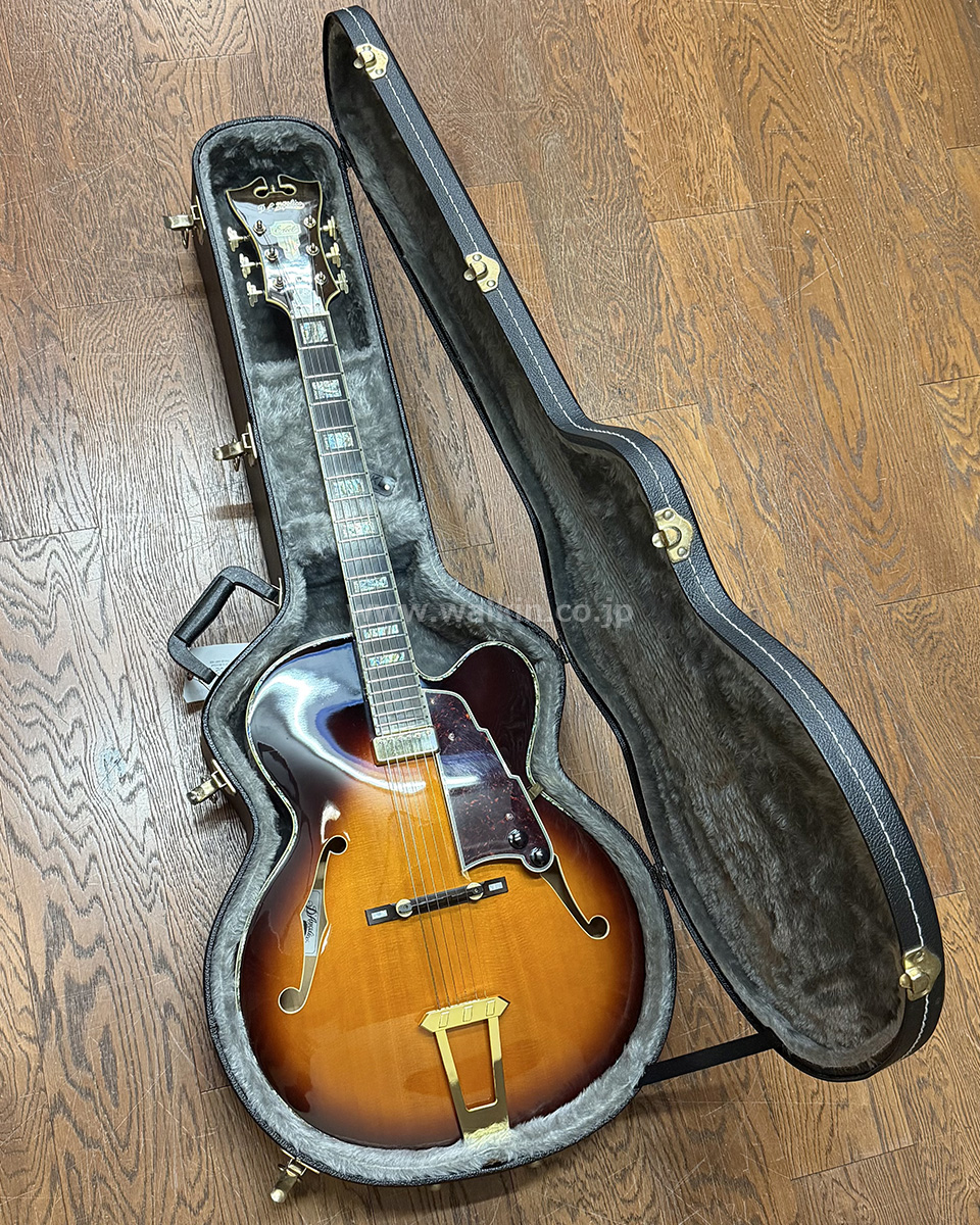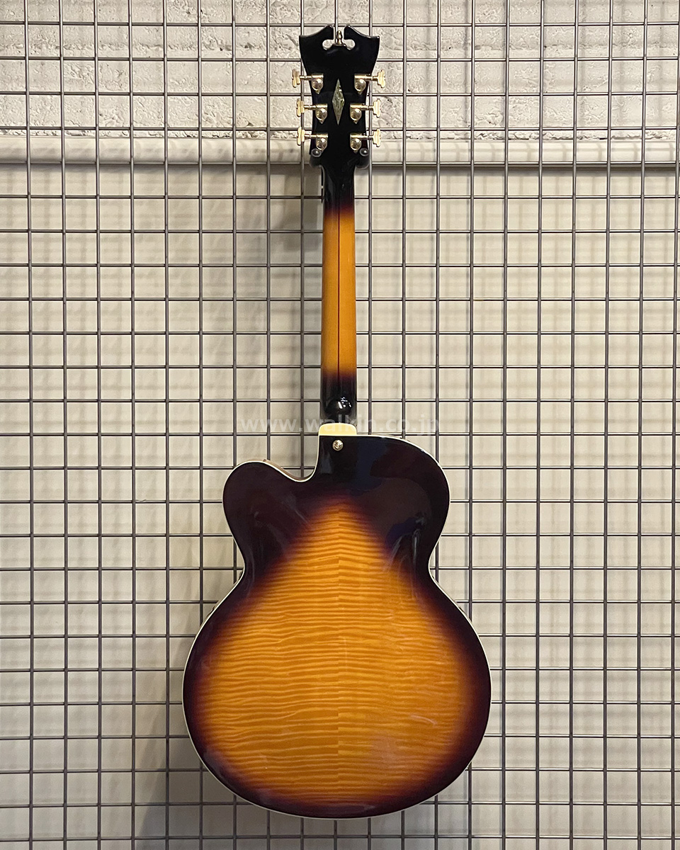 17インチ・ボディにメイプルネック、そしてDP仕様の特徴となるエボニー指板を採用。インレイやバインディングにはアバロンが用いられ、ボディバックの鮮やかなフレイム木目とともに、ゴージャスな外観に仕上げられております。