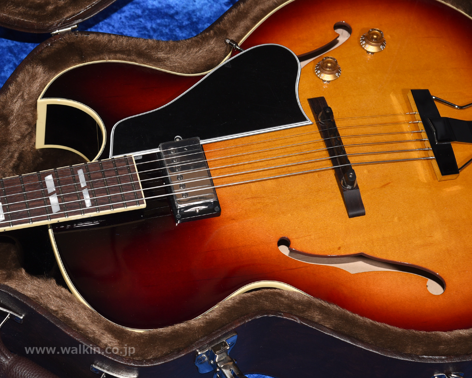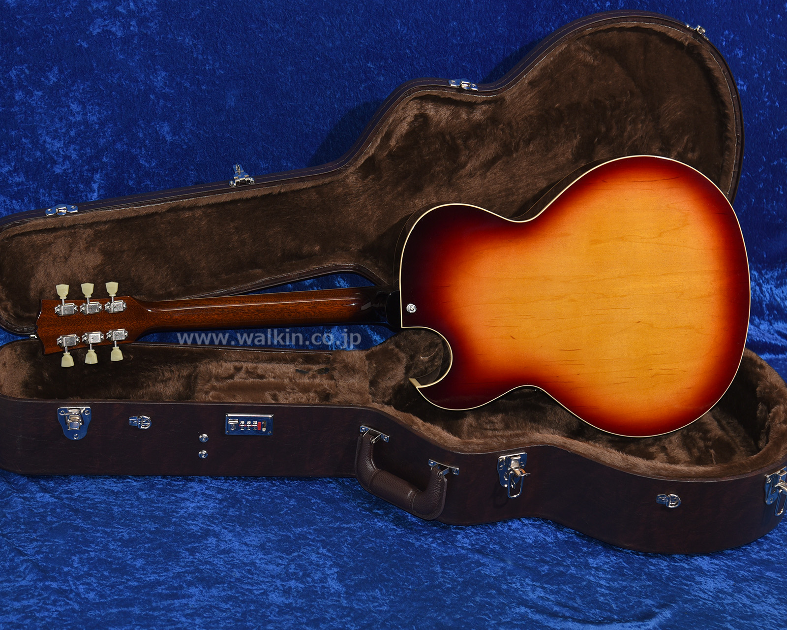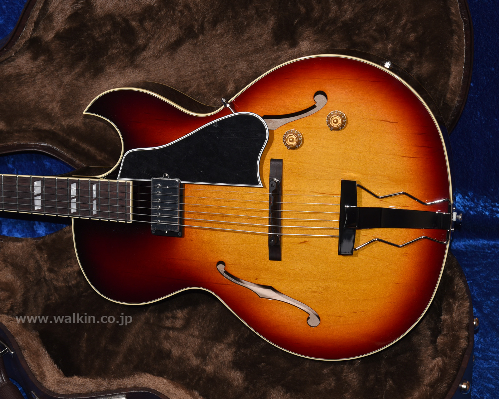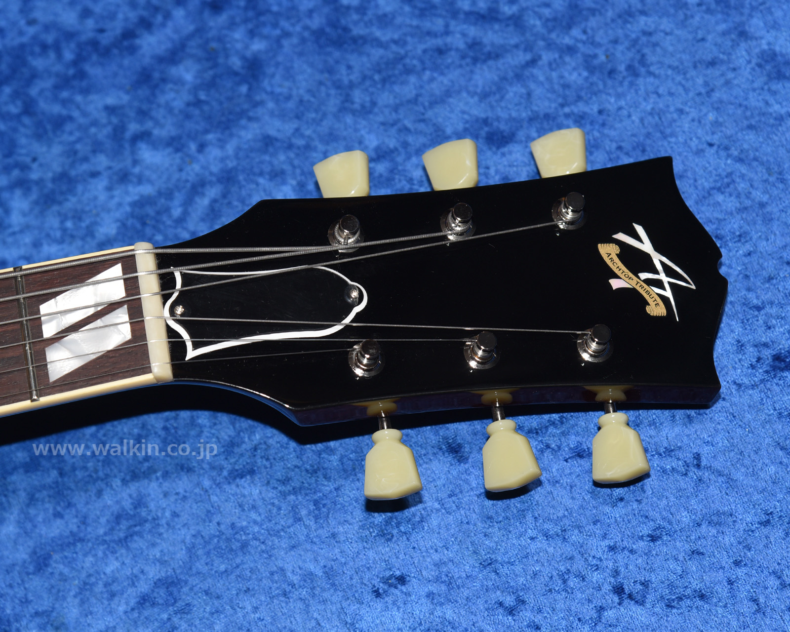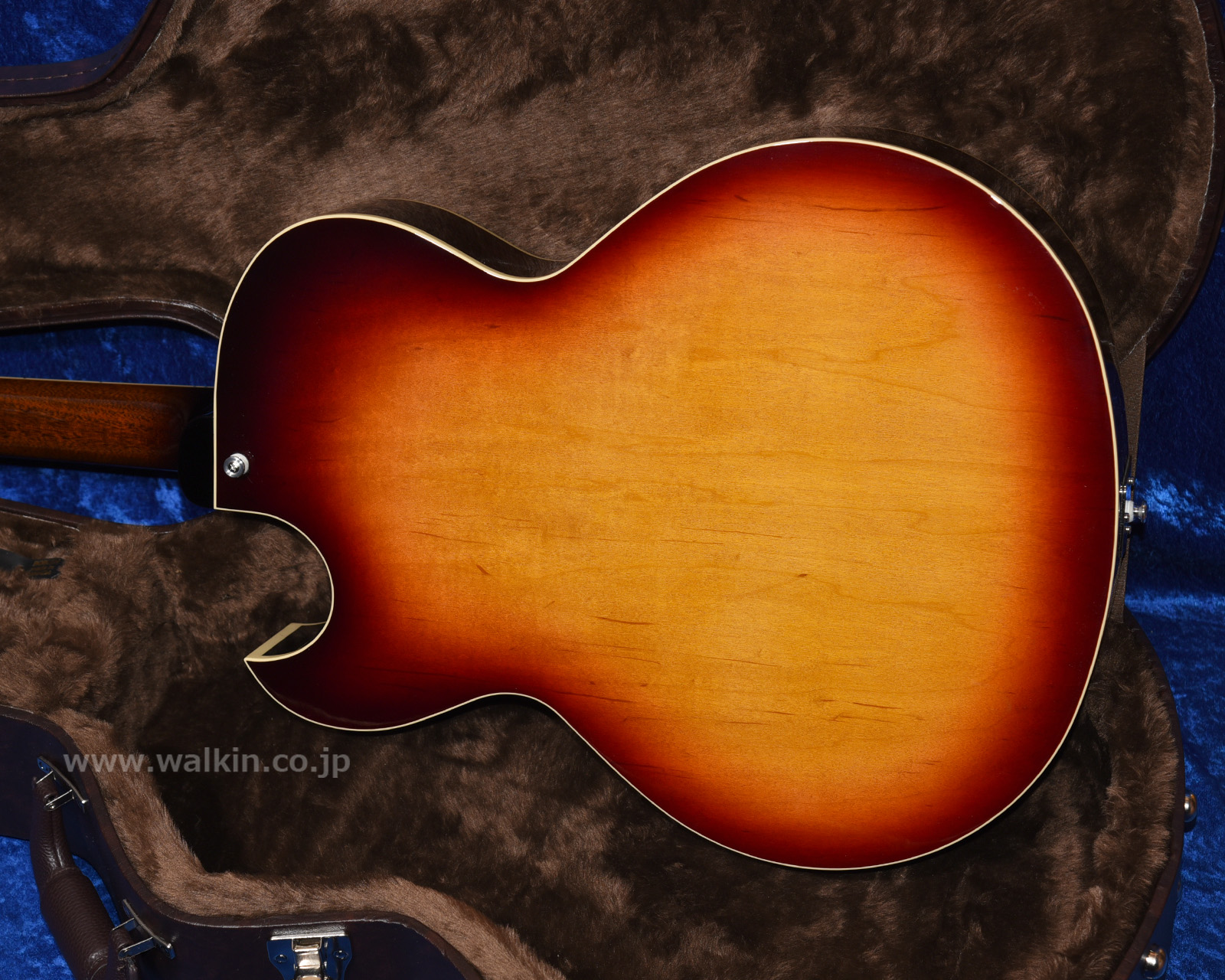 しっかりとしたグリップのマホガニー1ピースネックに組み合わされるのは、美しい茶褐色のインディアン・ローズウッド指板。ボディはハードメイプルとスプルースに拘って特注製作された「リッチ・プレゼンス・プライウッド」を用いたフルデプスの16インチ仕様となり、搭載されるブリッジ・アッセンブリーは汎用パーツではなく、ヴィンテージ・スタイルを継承しつつ全域でより快適なイントネーションが得られるよう形状加工された、ウォーキン工房によるオリジナル製作品です!