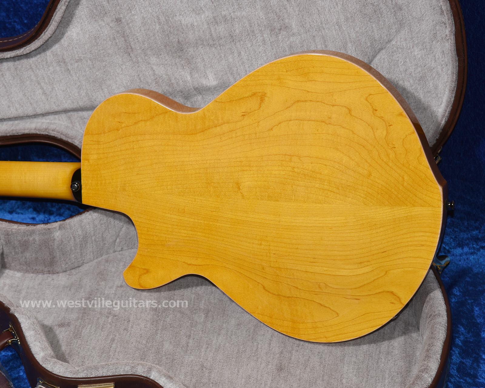 Its unique design and construction also features a solid carved (routed) “Hard Maple” side rim. This innovative and sophisticated design of the solid carved sides (side rim routed from 1 3/4″ thick “Hard Maple” plate) is complemented and enhanced by the structurally supportive and rigid “end block” on which the tailpiece of the guitar is mounted. The gorgeous Westville figured maple and brass hybrid tailpiece is directly attached to the end block of the guitar with a hard maple spacer providing the perfect balance between tension and resonance of the instrument.