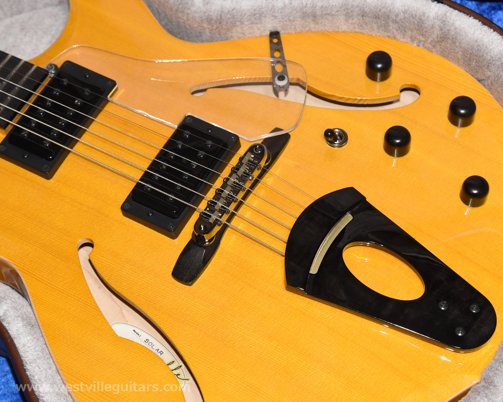 製品開発やモニタリングの期間中より国内外のアーティスト様方からも大絶賛を頂き、渡辺香津美さんや田島貴男さん、細井徳太郎さん、海外ではHristo VitchevさんやRomain Pilonさん、Albert Vilaさんのメインギターの1本としても活躍する「オール単板削り出し」のフルホロウ・モデル、ウェストヴィル「ソーラー」シリーズ。こちらはその薄ボディ/2×ハムバッカー仕様です。