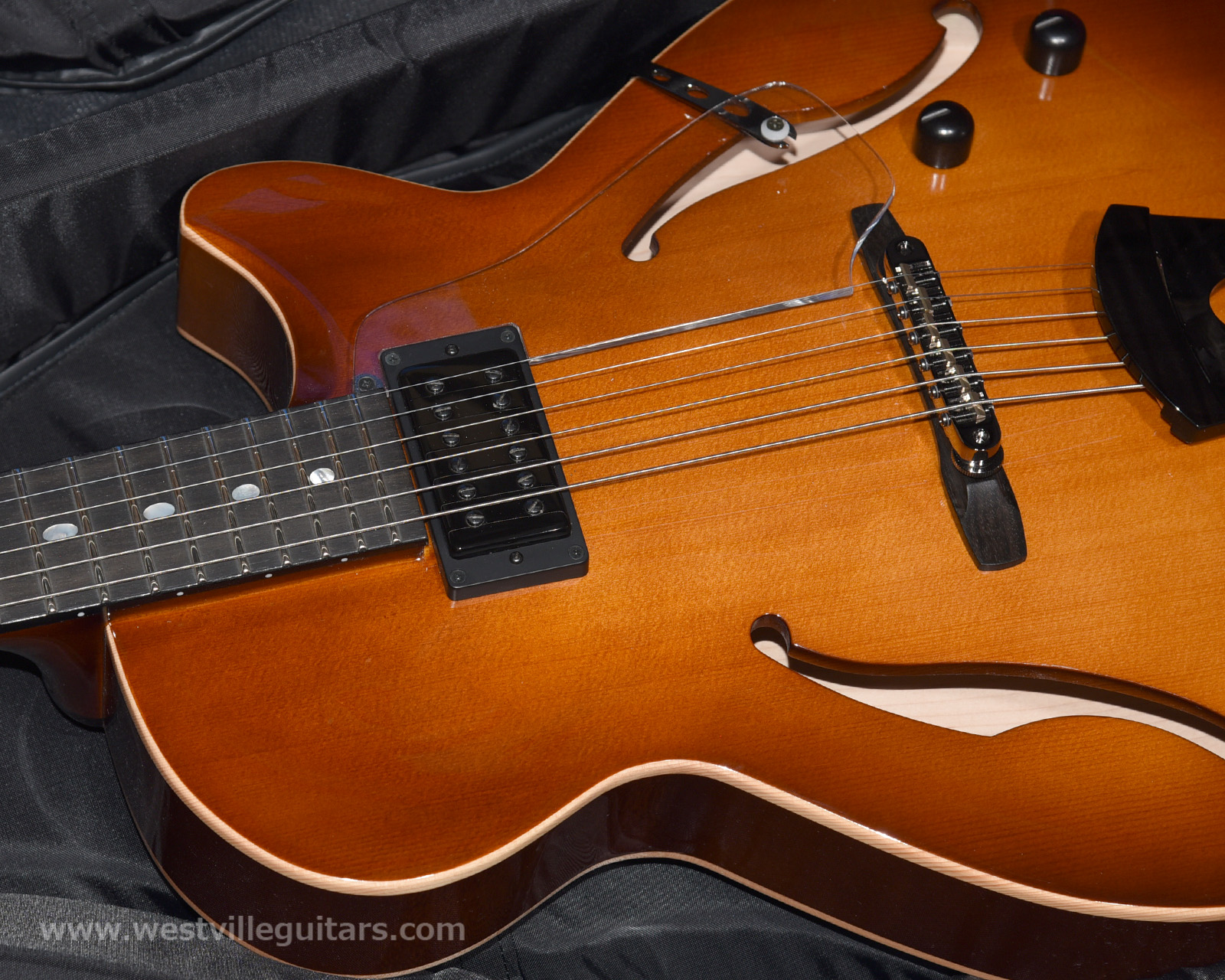 The guitar is a fully hollow archtop that features a solid carved “Stika Spruce” top and a solid carved “Hard Maple” back.