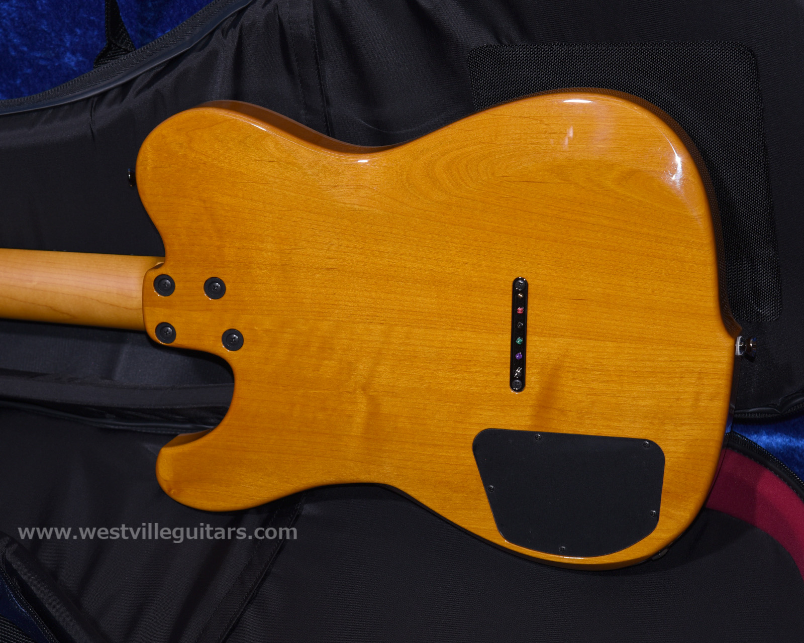 こちらのモデルは、ボディトップに単板のアルダー材を、そしてボディバックにも同じく単板のアルダー材を用いました。比較的ライトウェイトな仕上がりで、若干ながら従来の一般的なシンライン系テレキャスターに寄せたイメージとお考え頂いても良いかもしれません。軽やかさと適度な粘りが程良くミックスされたサウンドは、ファンク系のセッティングにもマッチします。