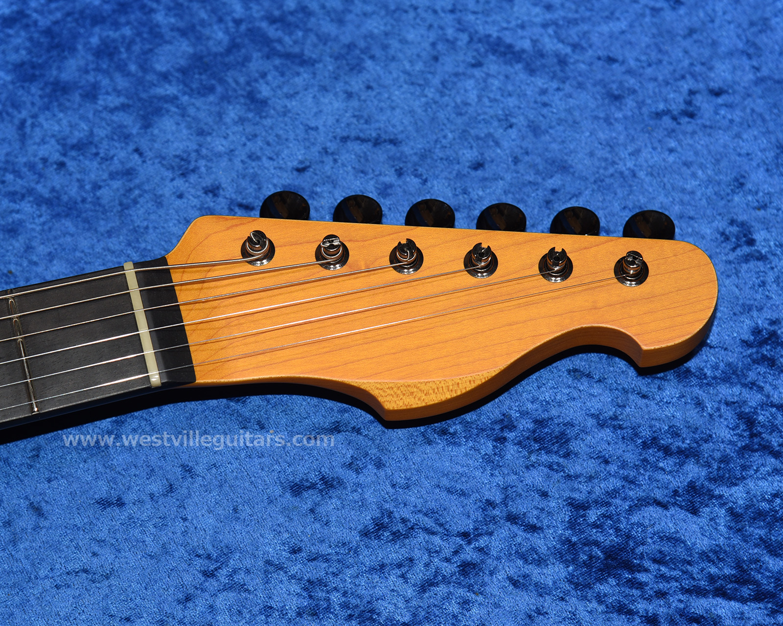 ネックはハードメイプルの1ピース。指板にはエボニー(本黒檀)をチョイスしました。理想のヘッドアングルと強度を目指し、かつペグの取り付け角度を適正化しチューニング時のフリクションを抑えるオリジナル形状の段付きテーパードヘッドにも、Westel独自のアイディアが込められております。