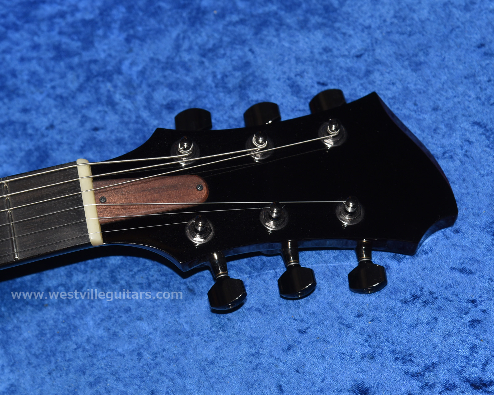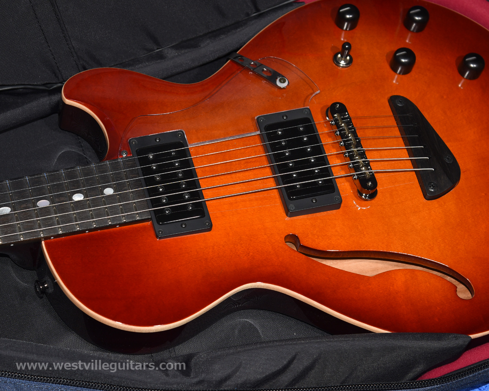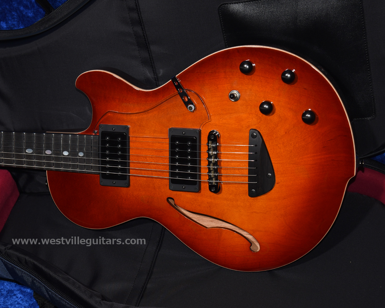 所謂レスポール・サイズのボディを持つセミソリッド・モデル「Sonny(サニー)」シリーズ。6弦側にのみWestvilleオリジナル・デザインのサウンドホールがレイアウトされた削り出しのボディトップには、フルアコ等に用いる分厚いシトカ・スプルース(Sonny S)、またはハードメイプル(Sonny M)をチョイス。ボディバックには良質な1ピースのホンデュラス・マホガニー材を用い、こちらはその両側に独自形状のチェンバー加工が施されております。