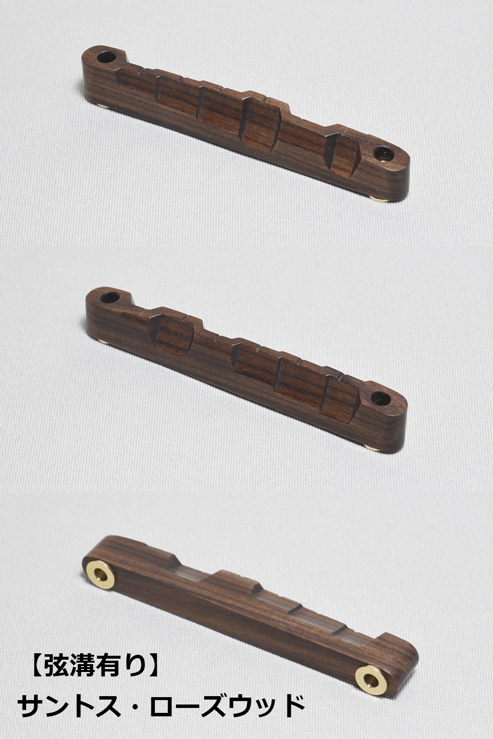 サントス・ローズウッド(ボリヴィアン・ローズウッド/パーフェロー)材を用い弊社工房にて製作を致しました、極めて高い質感を誇るヴィンテージ・フルレプリカ形状のウッドサドルです。上面アールは12″、ブリッジポスト間のスペースは約73.5mm、全高はサドルブッシングを除き約13.5mm程度の設定です。